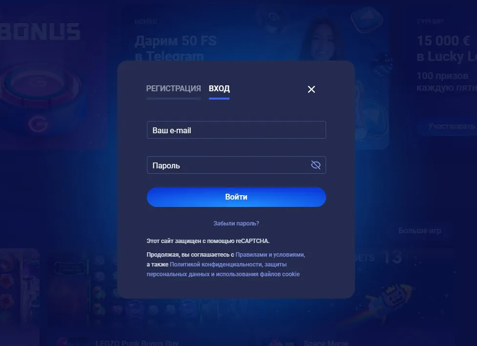 - Через социальные сети: мгновенная авторизация через Google или Telegram.