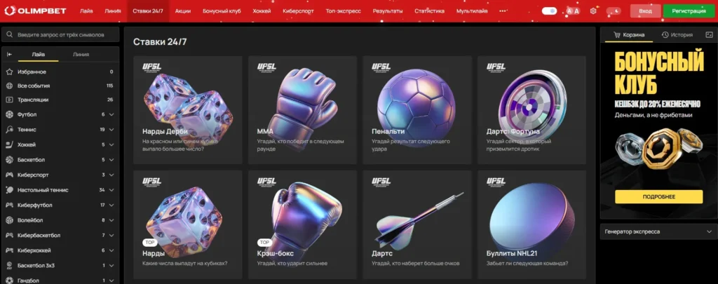 Олимпбет официальный сайт выполнен в современном стиле с преобладанием темных тонов и акцентами на ключевых элементах. Главная страница сразу предоставляет доступ к основным разделам: спортивные события, live-ставки, результаты матчей. Навигация продумана так, чтобы пользователь мог быстро найти нужное событие или рынок.
