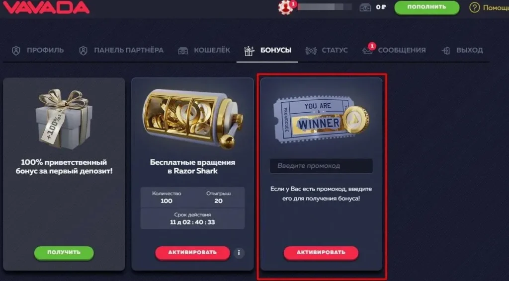 - Бонусы. Выдаются разнообразные поощрения. Реализовано поле для активации действующих промо.